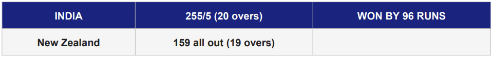 - ✓ India’s 96-run margin is their largest winning margin in any T20 World Cup match.