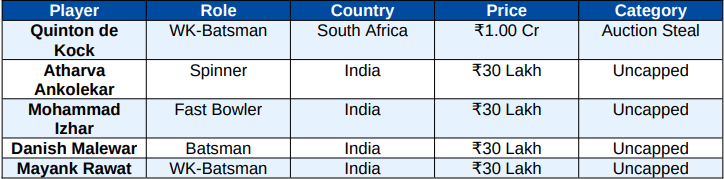 Total Available Purse: โน2.75 Crore (Lowest among all teams)